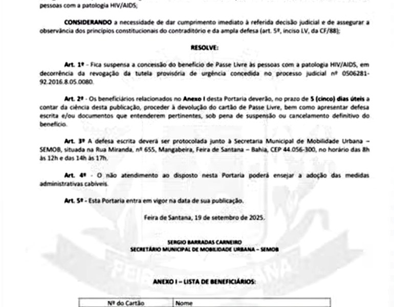 Uma grave falha marcou o fim de semana em Feira de Santana, segunda maior cidade da Bahia. A Prefeitura divulgou, no Diário Oficial do sábado (20/9), os nomes de mais de 600 pessoas vivendo com HIV, além de pacientes com fibromialgia e anemia falciforme, ao anunciar a suspensão do benefício do passe livre no transporte coletivo urbano. Horas depois, a publicação foi retirada do ar.