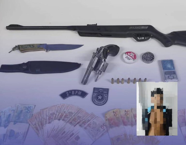 Durante a abordagem, os policiais realizaram busca pessoal e, em seguida, localizaram um revólver calibre .38 no local onde o objeto foi jogado. O suspeito confessou ser o dono da arma. Em sua residência, os militares encontraram ainda munições, uma balança de precisão, uma faca tipo trincha, uma espingarda de seta, diversas munições de chumbinho e R$ 1.534,35 em espécie.