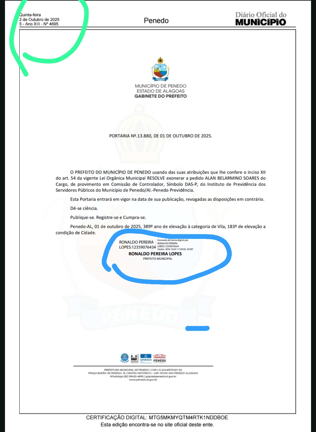 Os protocolos oficiais tanto do TCE-AL quanto da prefeitura de Penedo demonstram que, apesar do pedido de exoneração antecedente, a efetivação do ato pelo prefeito ocorreu exatamente no mesmo dia e com apenas uma hora de diferença da notificação sobre a denúncia no tribunal de contas.