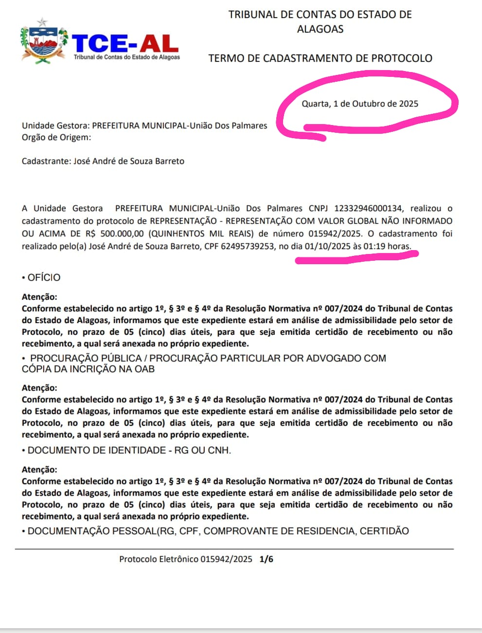 • 2 de outubro, 10h06: notificação formal da prefeitura sobre a representação no TCE
