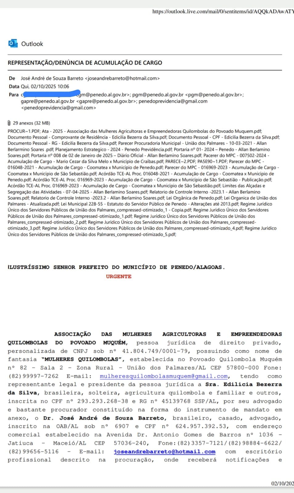 • 1º de outubro: protocolização da denúncia por acúmulo de cargo no TCE-AL pela Associação das Mulheres Quilombolas do Muquém