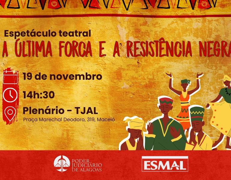 Em comemoração ao Dia da Consciência Negra, o Tribunal de Justiça de Alagoas (TJAL), por meio da Escola Superior da Magistratura (Esmal), realizará no dia 19 de novembro, às 14h30, a apresentação da peça teatral "A Última Forca e a Resistência Negra", no Plenário do TJAL.
