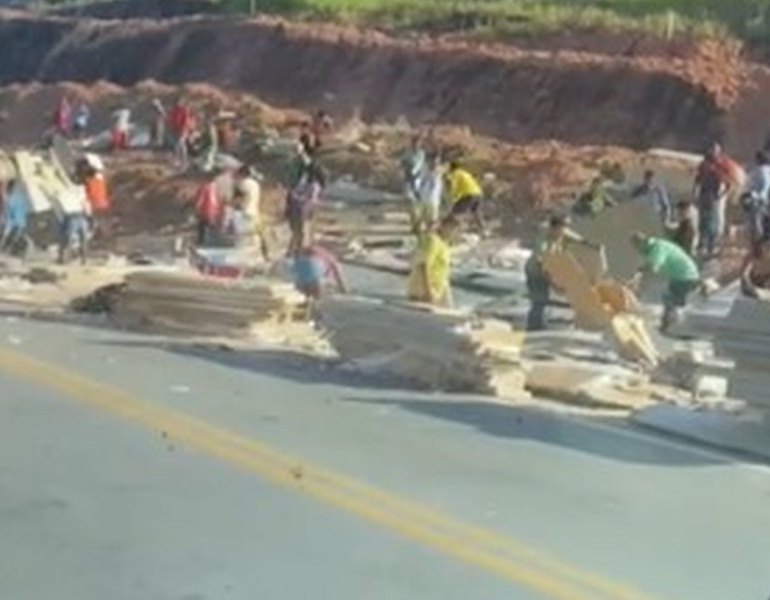 Após o tombamento, moradores da região saquearam parte da carga espalhada pela pista. Imagens registradas no local mostram pessoas recolhendo o material, enquanto o veículo permanecia virado no acostamento da rodovia.