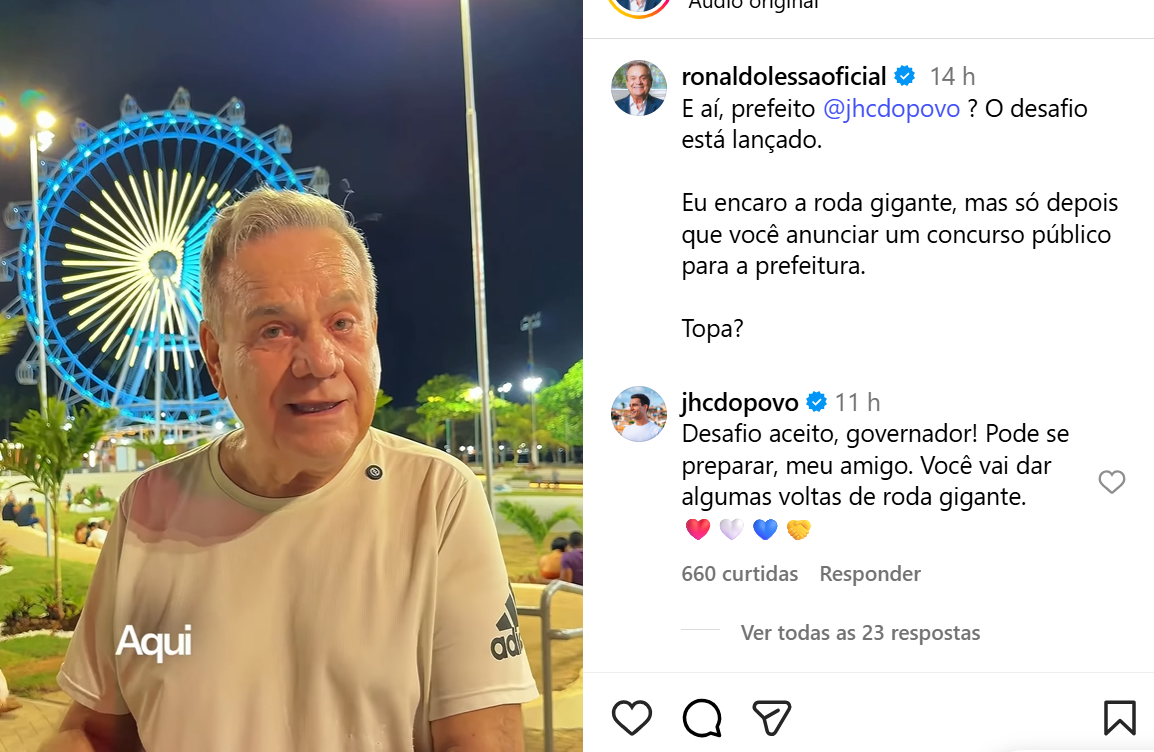Em resposta, JHC entrou na brincadeira e reforçou o bom humor da disputa política. “Desafio aceito, governador! Pode se preparar, meu amigo. Você vai dar algumas voltas de roda-gigante”, publicou o prefeito, arrancando risadas dos internautas e gerando uma enxurrada de comentários.