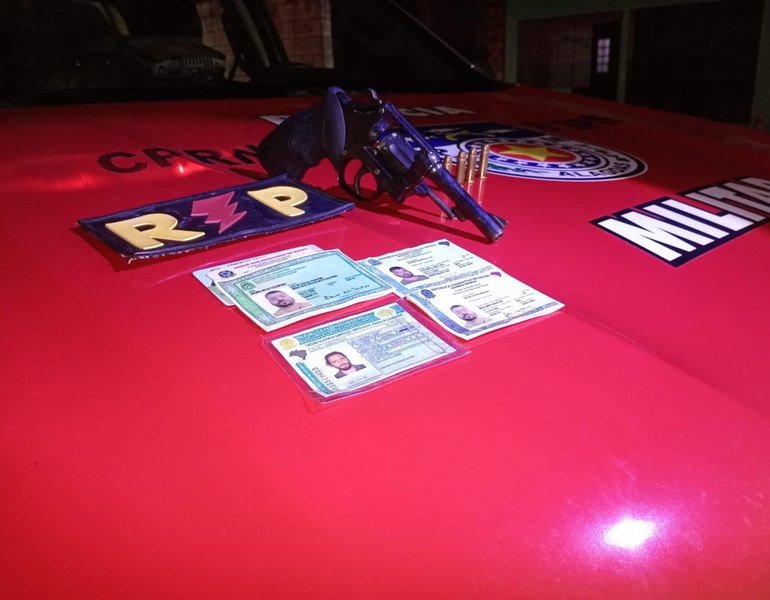 Ao chegarem ao local, os militares encontraram a vítima, que confirmou ter sido agredida e intimidada pelo suspeito. Durante a abordagem ao veículo onde o homem estava, os policiais localizaram um revólver com quatro munições intactas, duas bombinhas de cocaína e um conjunto de documentos falsificados contendo a foto do acusado, além de documentos originais pertencentes a outras pessoas.