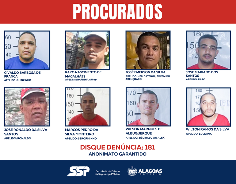 As forças policiais de Alagoas ampliaram, nesta segunda-feira (8/12), as ações para localizar e prender oito criminosos apontados como de alta periculosidade e que agora integram uma lista nacional divulgada pelo Ministério da Justiça e Segurança Pública. A relação faz parte do Programa Captura, que reúne alvos com mandados de prisão considerados prioritários para enfraquecer organizações criminosas no país.