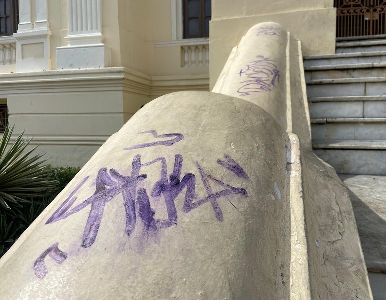 Entidade constatou pichações na escadaria do edifício e cobra reforço na segurança para proteger o patrimônio histórico