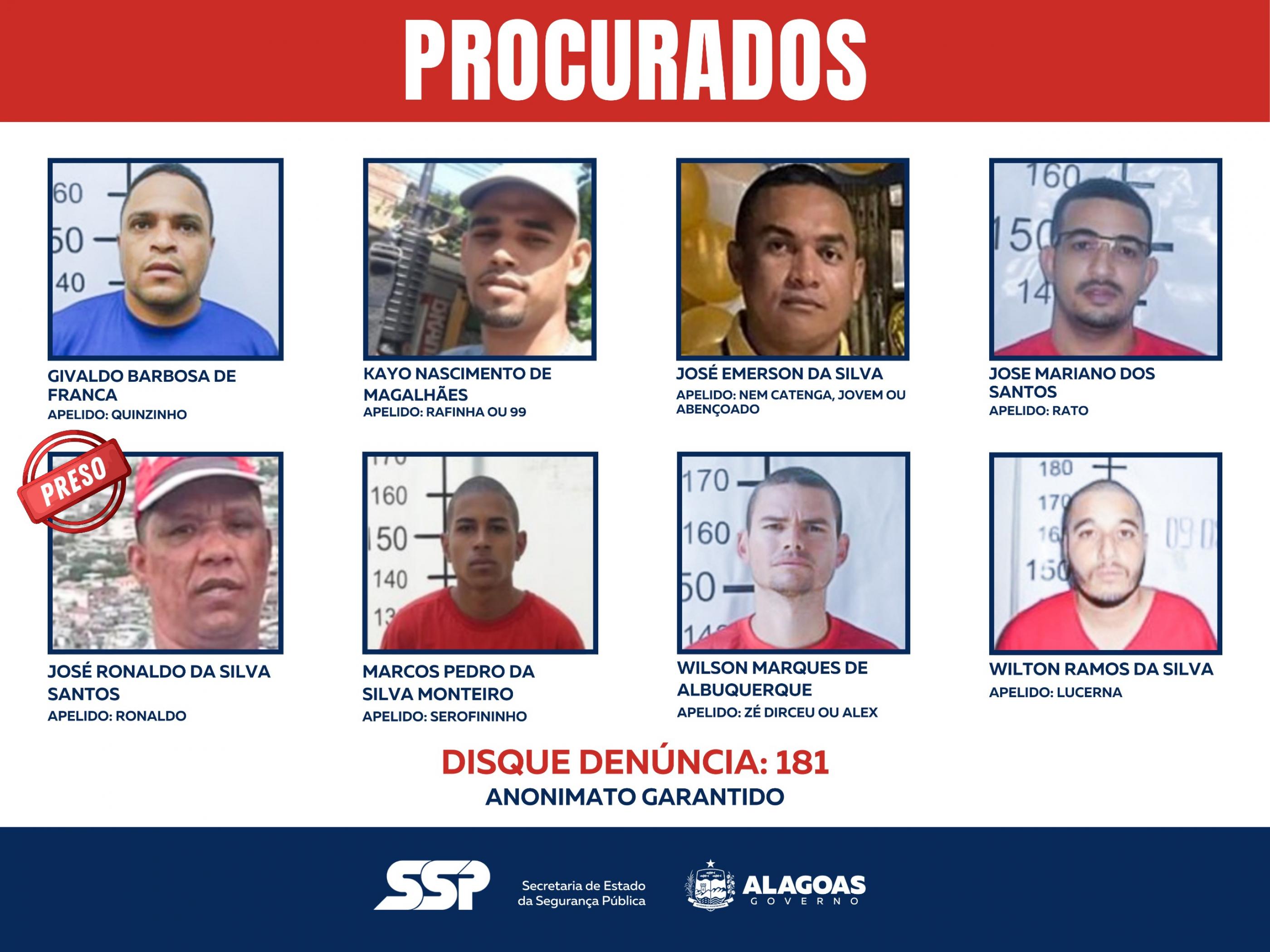 A SSP/AL segue na busca pelos outros sete procurados da lista: José Emerson da Silva (Nem Catenga/Jovem/Abençoado), Kayo Nascimento de Magalhães (Rafinha/99), Givaldo Barbosa de França (Quinzinho), Wilton Ramos da Silva (Lucerna), Marcos Pedro da Silva Monteiro (Serofinho), José Mariano dos Santos (Rato) e Wilson Marques de Albuquerque (Zé Dirceu/Alex). Denúncias podem ser feitas de forma sigilosa pelo Disque-Denúncia 181.