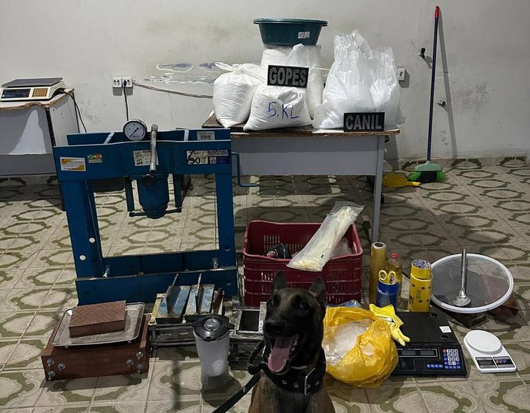 No interior da residência, foram apreendidos cerca de 51 quilos de substância análoga à cocaína, além de prensas hidráulica e manuais, balanças industriais e de precisão, utensílios usados no refino, embalagens, ferramentas e um aparelho celular, configurando um esquema estruturado de processamento de entorpecentes.