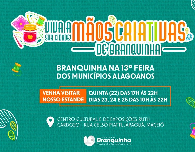 Durante a feira, Branquinha apresenta o estande “Mãos Criativas de Branquinha”, espaço dedicado à exposição e comercialização de produtos artesanais. Ao todo, dez artistas locais participam da iniciativa, levando ao público peças de decoração, artesanato diverso, além de doces e geleias caseiras produzidos no município.
