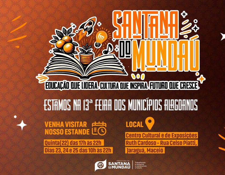 Entre os dias 22 e 25 de janeiro, o Centro de Convenções de Maceió sedia a 13ª Feira dos Municípios Alagoanos, promovida pela Associação dos Municípios Alagoanos (AMA). Santana do Mundaú está entre as cidades participantes e leva ao evento um estande que evidencia ações da gestão municipal e, principalmente, a força da cultura e do artesanato local.