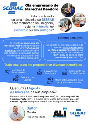 O município de Marechal Deodoro passa a contar com o Projeto Agente da Inovação, iniciativa do Sebrae Alagoas que visa promover o crescimento estruturado e a modernização de micro e pequenas empresas. O Instituto de Desenvolvimento Educacional e Social do Nordeste (IDESNE) atua como parceiro institucional, contribuindo para ampliar o alcance da ação e aproximar os empresários das oportunidades oferecidas.