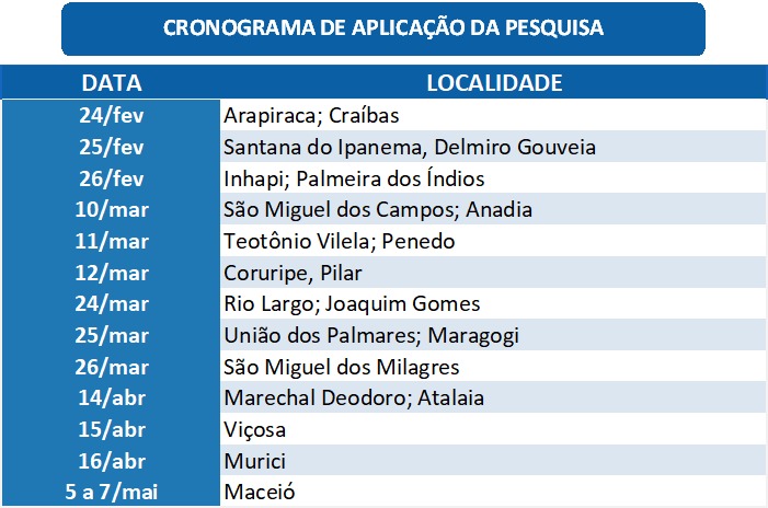 O levantamento contempla os municípios de Arapiraca, Craíbas, Santana do Ipanema, Inhapi, Delmiro Gouveia, Palmeira dos Índios, Pilar, Anadia, São Miguel dos Campos, Teotônio Vilela, Penedo, Coruripe, Rio Largo, Maragogi, São Miguel dos Milagres, Marechal Deodoro, Atalaia, Viçosa e Maceió.