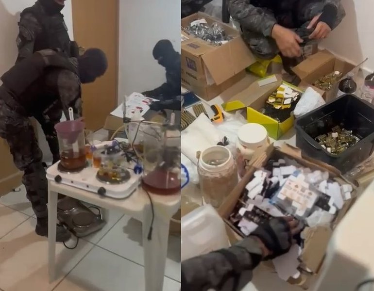 No endereço informado, os militares localizaram uma estrutura montada para a fabricação ilegal de medicamentos, incluindo insumos químicos, embalagens, selos falsificados e dezenas de munições. Segundo relato do preso, os produtos adulterados seriam comercializados pelo comparsa que fugiu.