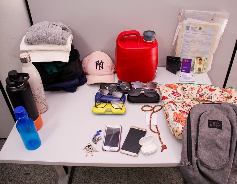 Entre os materiais catalogados estão documentos pessoais, peças de vestuário, garrafas térmicas, mochilas e aparelhos celulares. A devolução segue procedimento administrativo padrão, com conferência de identificação para garantir a entrega ao proprietário correto.