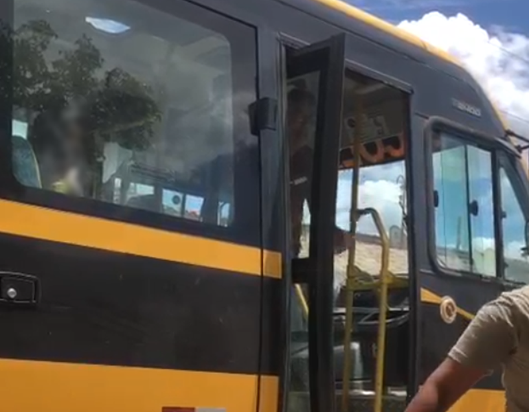 Nas imagens, é possível ver o motorista identificado como Washington Luis Soares da Silva dentro do ônibus escolar segurando uma mangueira enquanto discute com o estudante. O veículo é utilizado para transportar alunos da Escola Estadual José Soares Pinto, localizada no Centro do município.