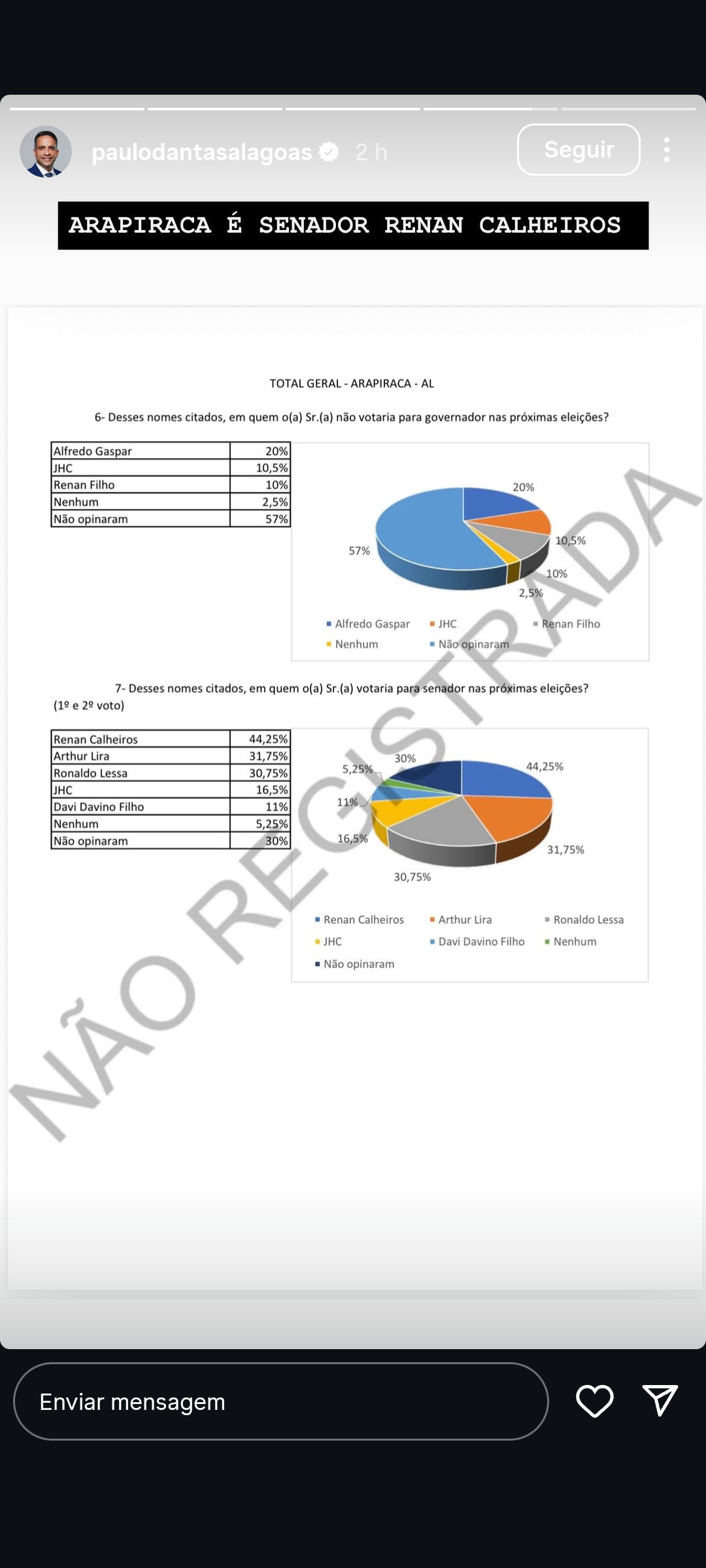 O governador Paulo Dantas (MDB) publicou no seu perfil oficial no Instagram levantamento de intenção de voto sem registro no TSE. A lei exige registro prévio desde 1º de janeiro de 2026, por ser ano eleitoral.