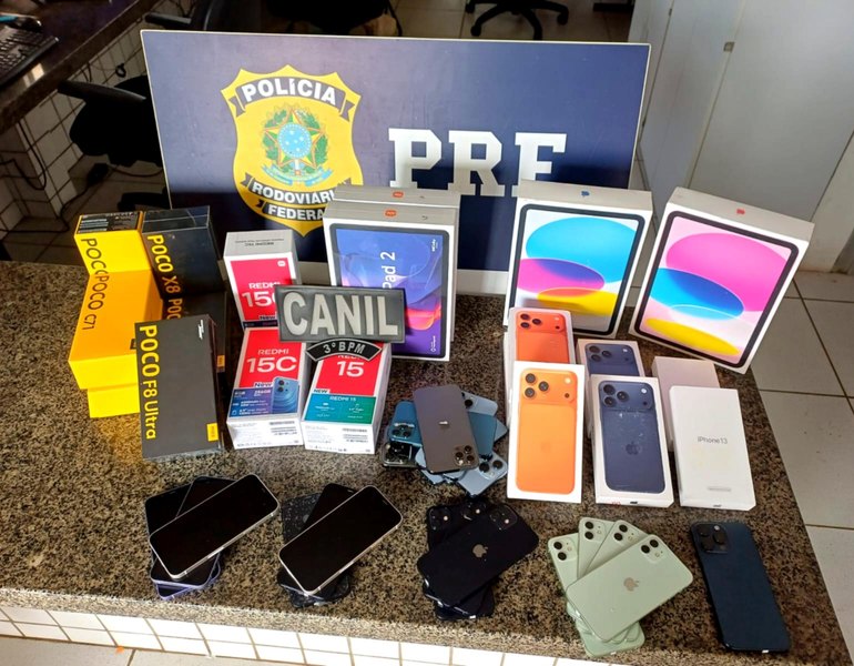 Foram apreendidos 36 aparelhos entre smartphones e tablets, além de itens recondicionados, fones, microfones e acessórios sem nota fiscal.