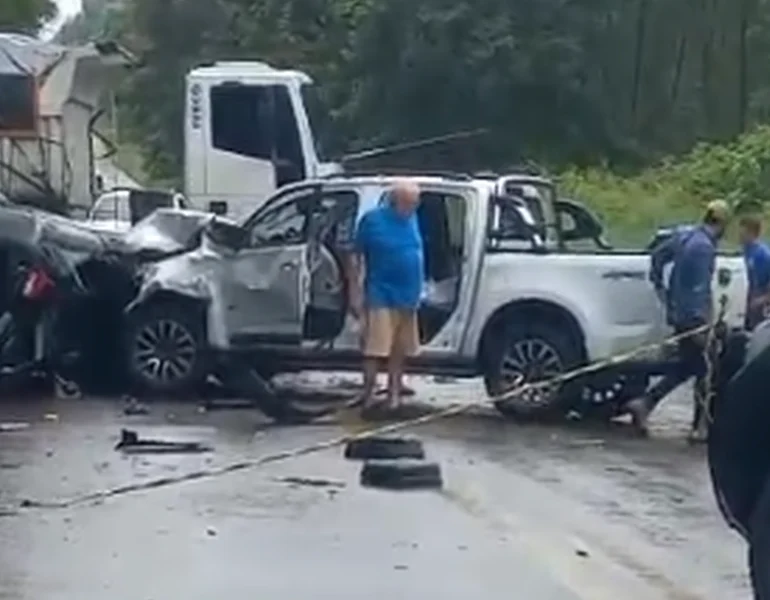 A caminhonete branca e o outro veículo colidiram frontalmente e ficaram atravessados na rodovia. No momento do acidente, chovia na região, segundo registros do local.