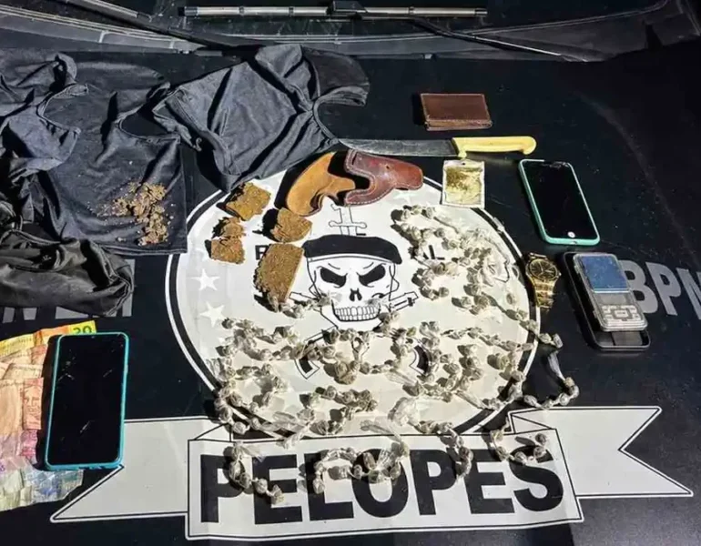 Na ocorrência, os militares apreenderam aproximadamente 130 gramas de maconha, uma balança de precisão, quatro aparelhos celulares, seis balaclavas, um coldre de revólver, dinheiro em espécie e embalagens utilizadas no tráfico.