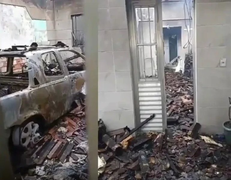 As chamas se espalharam rapidamente e provocaram a perda total da residência, além de destruir um veículo que estava estacionado na garagem.